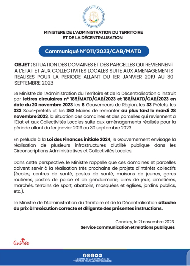 Dans un communiqué dont copie est parvenue à notre rédaction, le ministère de l’administration du territoire et de la décentralisation instruit aux administrateurs territoriaux et élus locaux de faire la situation des domaines et parcelles de l’Etat.