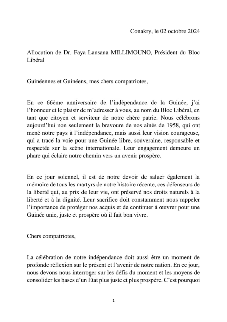 Dr. Faya Lansana Millimouno appelle à une Guinée unie, sécurisée et démocratique en ce 66ème anniversaire de l’indépendance