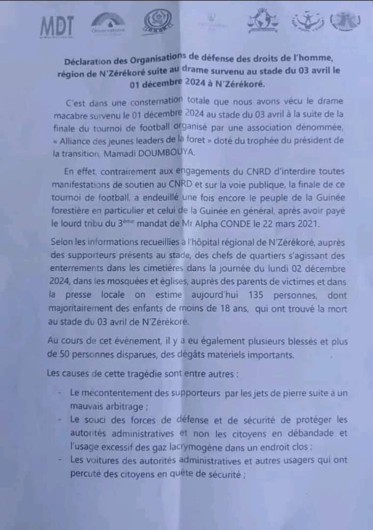 Suite à la tragédie survenue lors de la finale d’un tournoi de football organisé au stade du 03 avril à N’Zérékoré, qui a causé la mort de 135 personnes, principalement des enfants, les organisations de défense des droits de l’ homme de la région pointe du doigt les organisateurs et le CNRD. Elles réclament des enquêtes judiciaires et appellent à la retenue pour préserver la cohésion sociale.
