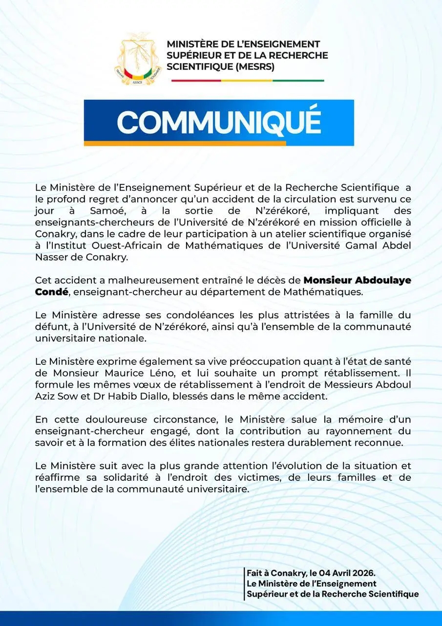 Dans un communiqué officiel, le Ministère de l’Enseignement Supérieur et de la Recherche Scientifique annonce le décès de l’enseignant-chercheur Abdoulaye Condé, victime d’un accident de la circulation survenu à Samoé, alors qu’il se rendait à Conakry pour une mission scientifique. Plusieurs autres universitaires ont été blessés.