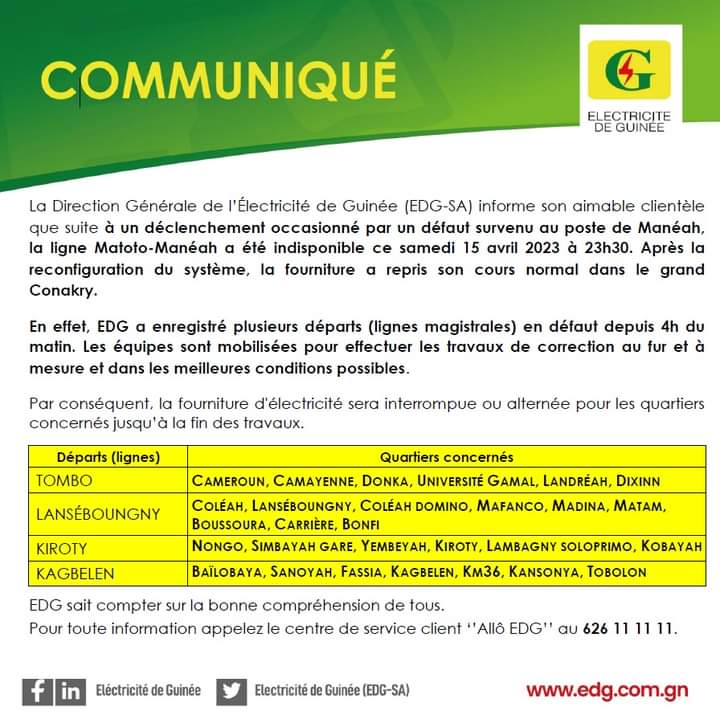 La direction générale de l’Electricité de Guinée donne des explications sur les causes des interruptions de la fourniture du courant ce samedi 15 avril 2023 dans le grand Conakry et certaines villes de l’intérieur du pays.