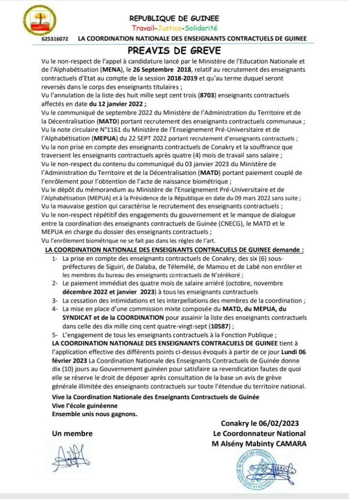 Les enseignants contractuels de la République de Guinée ont déposé un préavis de grève ce lundi 06 février 2023. Dans leur communiqué, ces contractuels en situation de classe depuis plusieurs années donnent 10 jours aux autorités pour satisfaire leurs revendications.
