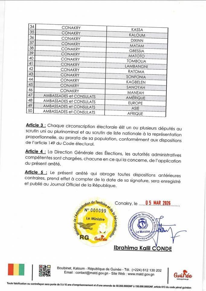 Par un arrêté signé le 5 mars 2026, le ministre de l’Administration du Territoire et de la Décentralisation, Ibrahima Kalil Condé, a fixé à cinquante le nombre de circonscriptions électorales pour les prochaines élections législatives prévues le 24 mai 2026. La répartition couvre l’ensemble des régions administratives de la Guinée, la ville de Conakry ainsi que les ambassades et consulats à l’étranger, dans le respect du principe de représentativité et d’égalité des citoyens dans l’expression du suffrage.