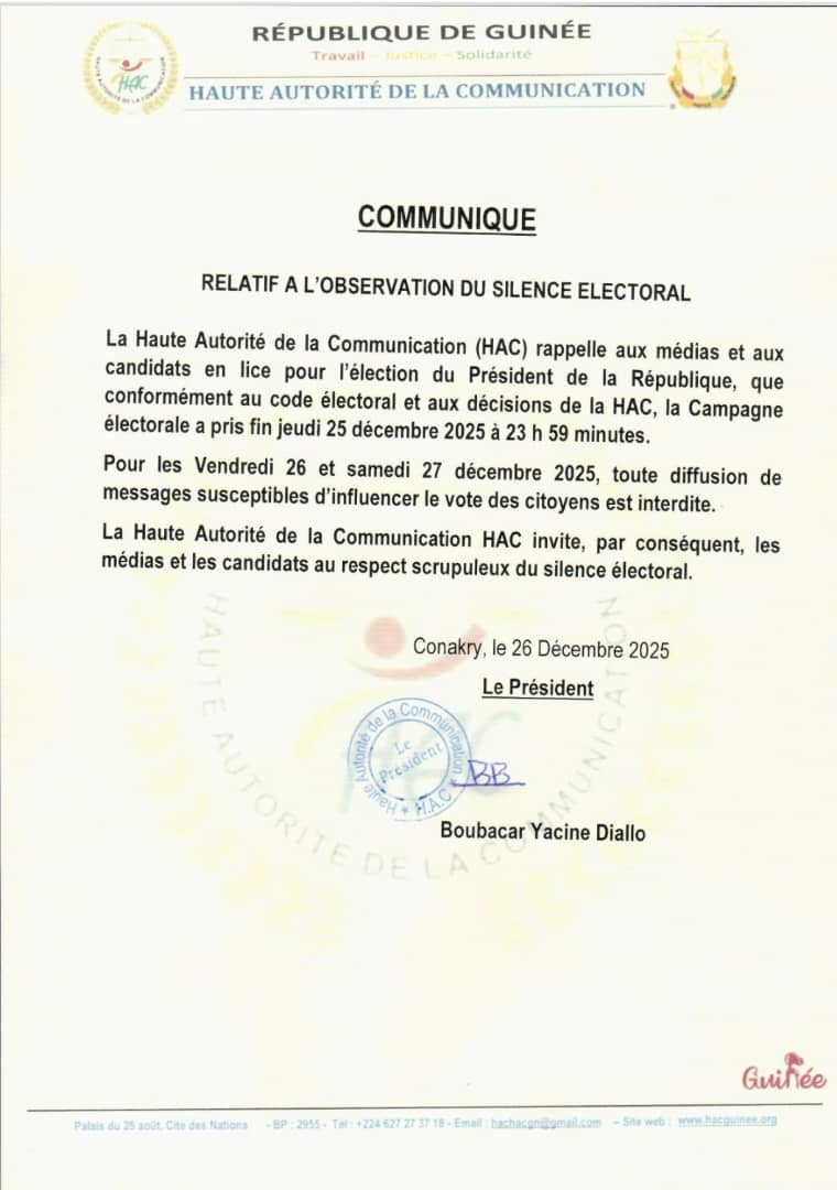 Élections présidentielles en Guinée : la HAC rappelle le strict respect du silence électoral