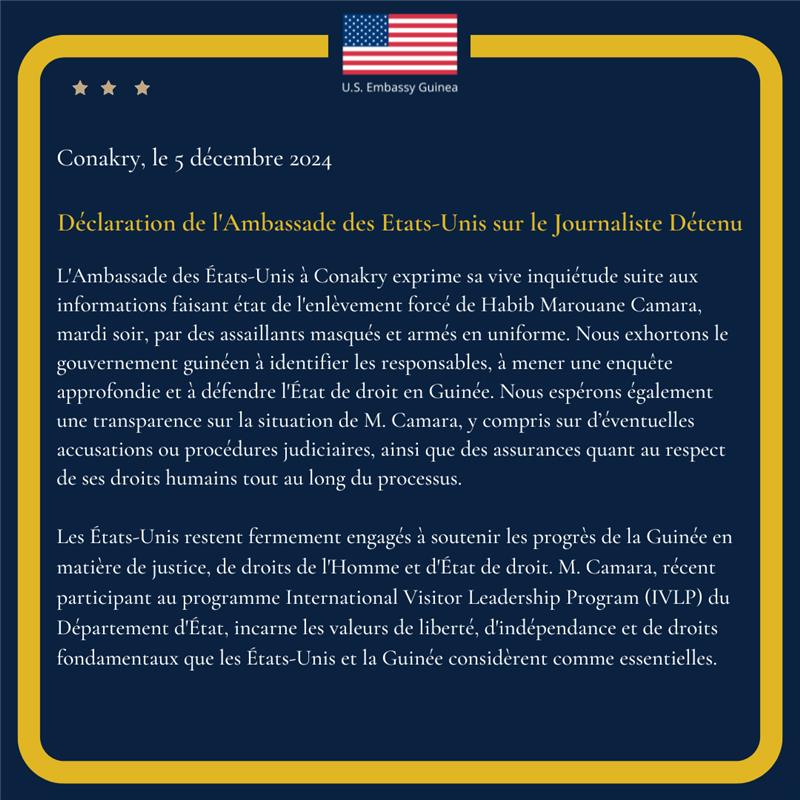 Au tour de l’ambassade des États-Unis en Guinée de réagir sur l’enlèvement forcé du journaliste Habib Marouane Camara.
