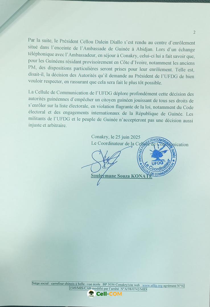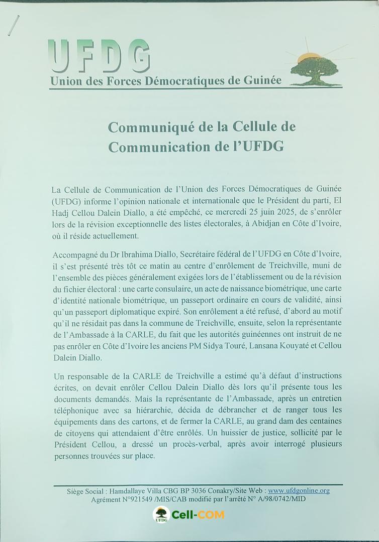 Dans un communiqué publié ce mercredi 25 juin 2025, la Cellule de Communication de l’UFDG dénonce l’empêchement de son président, Cellou Dalein Diallo, de s’enrôler lors de la révision exceptionnelle des listes électorales à Abidjan. Malgré des pièces justificatives complètes, l’ancien Premier ministre s’est vu refuser l’accès aux opérations d’enrôlement, sur instruction présumée des autorités guinéennes. Une situation que le parti qualifie de violation flagrante du Code électoral et des droits civiques.