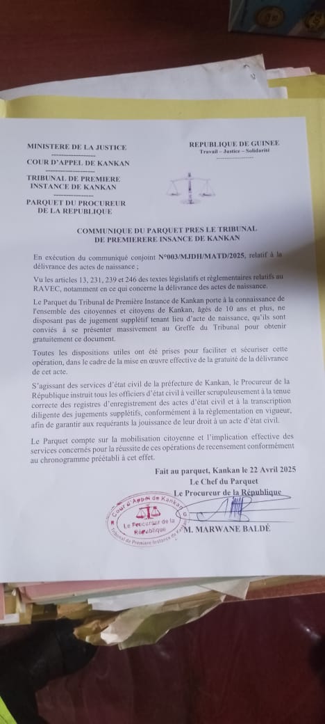 Dans le cadre de l’application du communiqué conjoint N°003/MJDH/MATD/2025, le Parquet près le Tribunal de première instance de Kankan lance une campagne spéciale de délivrance gratuite d’actes de naissance au profit des citoyens âgés de 10 ans et plus ne disposant pas de jugement supplétif. Les intéressés sont invités à se présenter au Greffe du Tribunal pour bénéficier de cette régularisation gratuite de leur état civil.