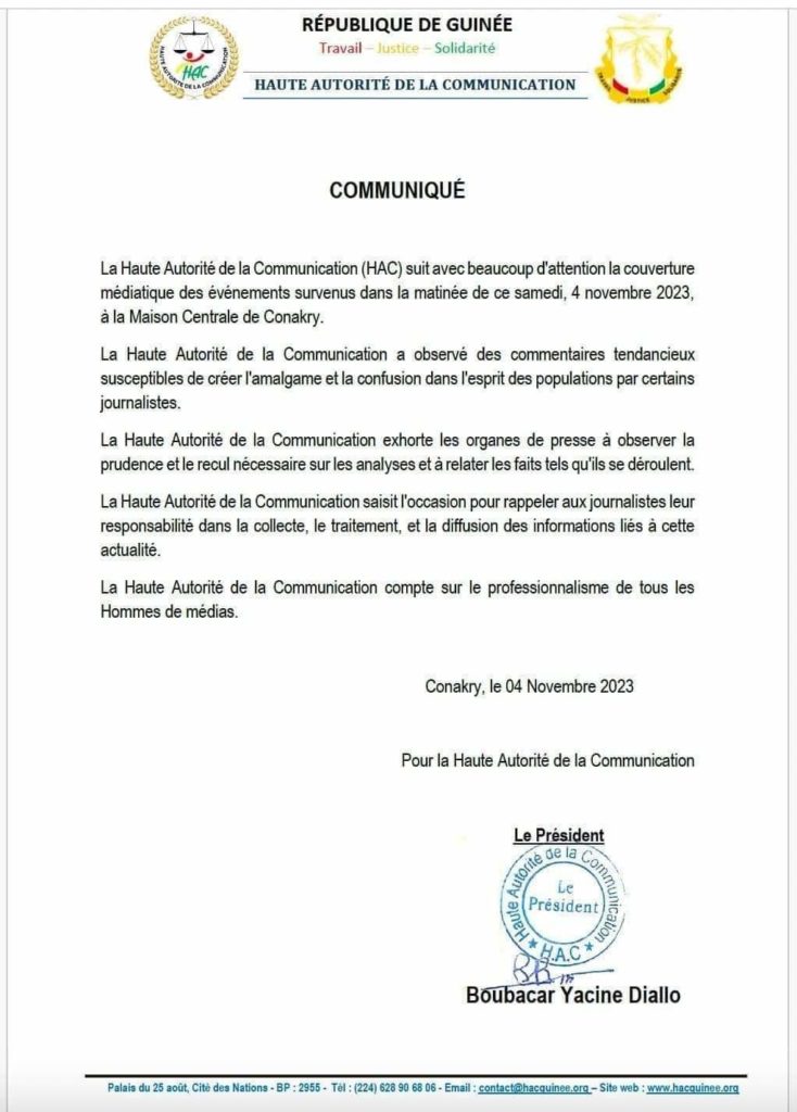 Juste après l’exfiltration de l’ancien président le capitaine Moussa Dadis Camara et ses codétenus à la maison centrale de Conakry dans la nuit de ce vendredi à samedi, la haute autorité de la communication à travers un communiqué rendu public ce samedi 4 novembre 2023 attire l’attention des journalistes dans la collecte de l’information.