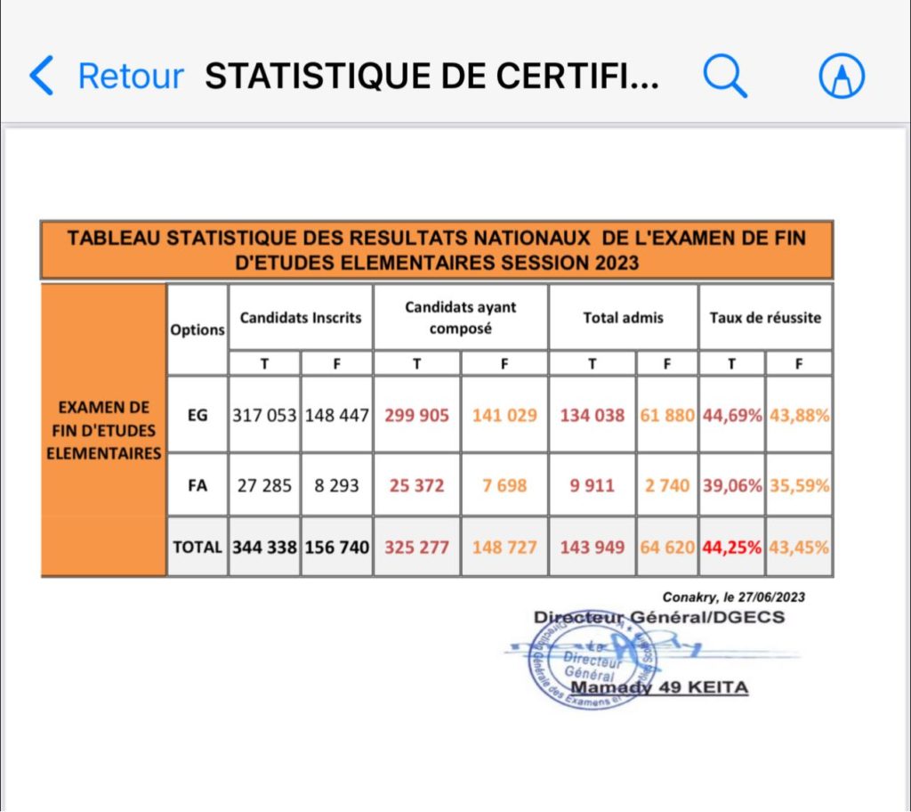 Le ministère de l’enseignement pré-universitaire a publié les résultats de l’examen d’entrée en 7e année session pour l’année 2022-2023. Sur 325.277 candidats ayant composé, 143.949 ont validé cet examen pour entrer au collège l’année prochaine.
