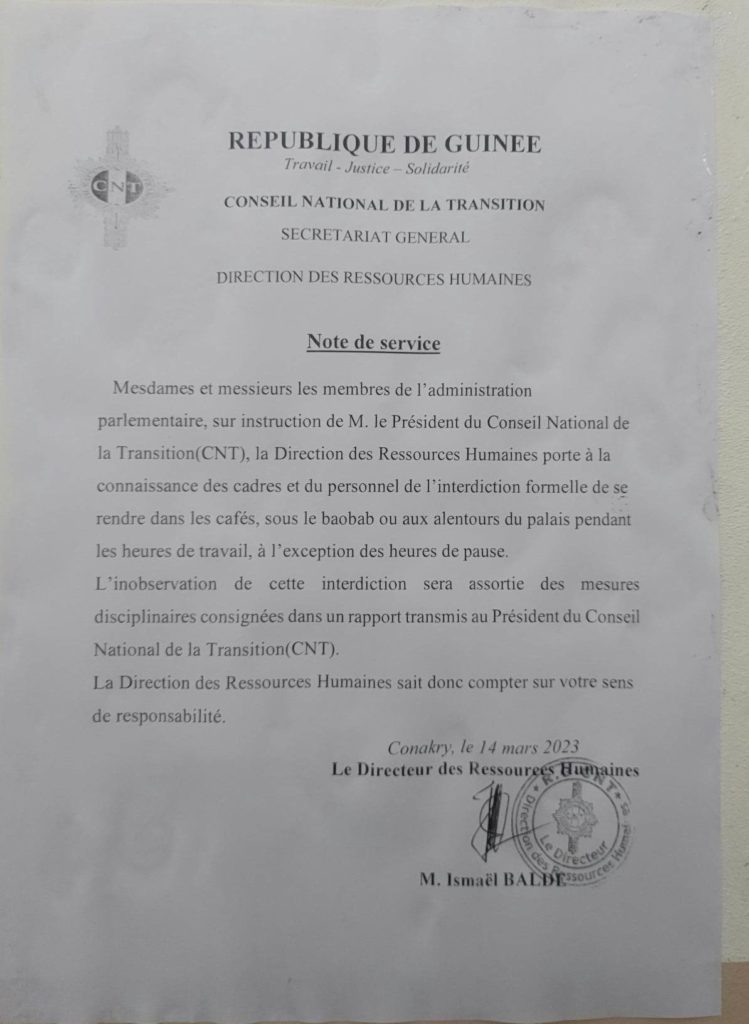 Ce soir ils sont nombreux ces travailleurs et agents parlementaires qui ont été surpris de voir afficher sur les murs devant des Bureaux du conseil national de la transition CNT, une note du Directeur des ressources humaines, un proche du président du CNT Dr Dansa Kourouma, qui restreint les mouvements des travailleurs de cet organe législatif, ou la démocratie devrait partir normalement.