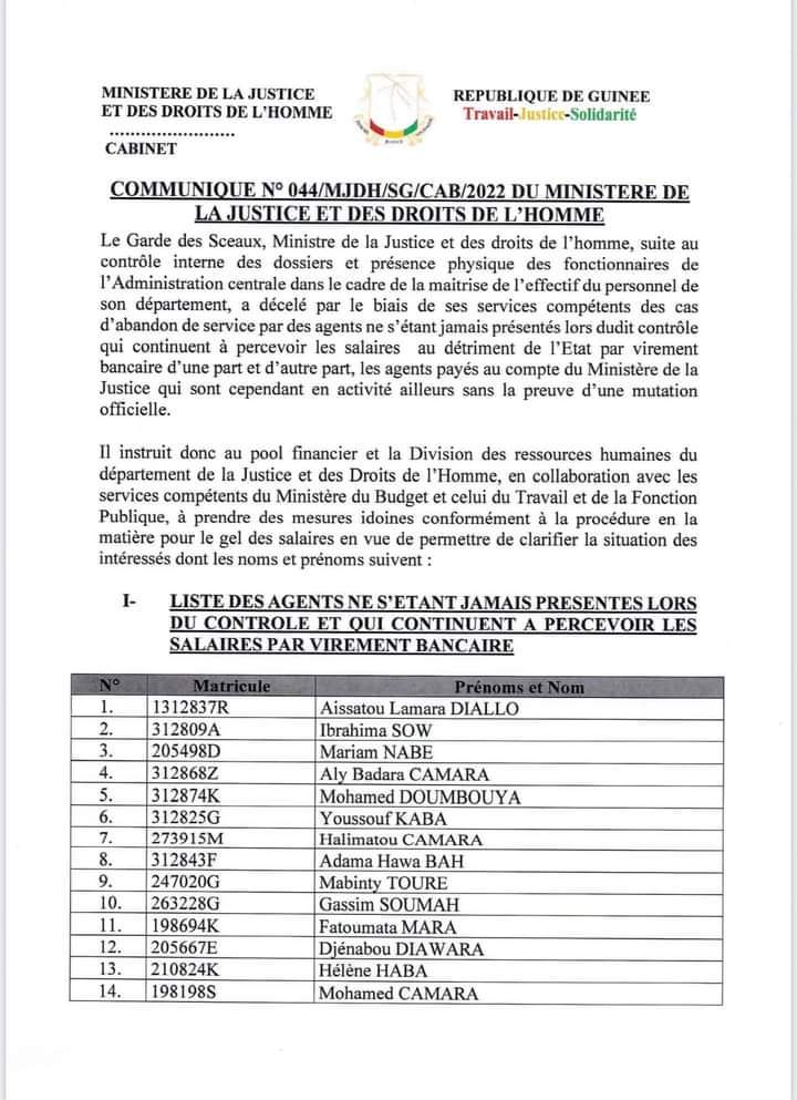 Dans le cadre du projet de contrôle du fichier des fonctionnaires du Ministère de la justice et des droits de l’homme, il ressort que 106 personnes sont dans une situation irrégulière.