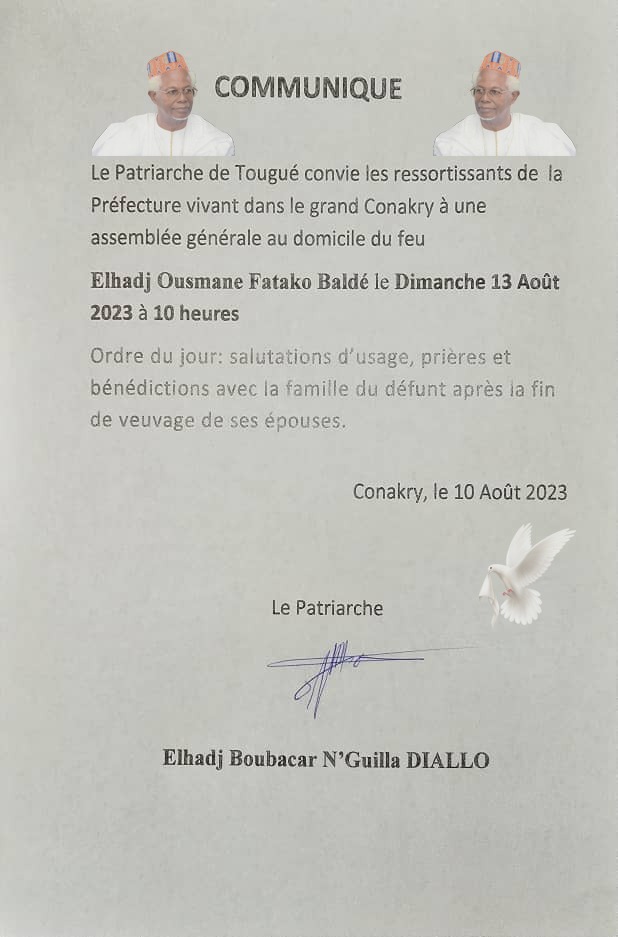Le patriarche de Tougué invite tous les ressortissants de sa préfecture à une assemblée générale au domicile du feu Elhadj Ousmane Baldé Sans Loi, le dimanche 13 août 2023.