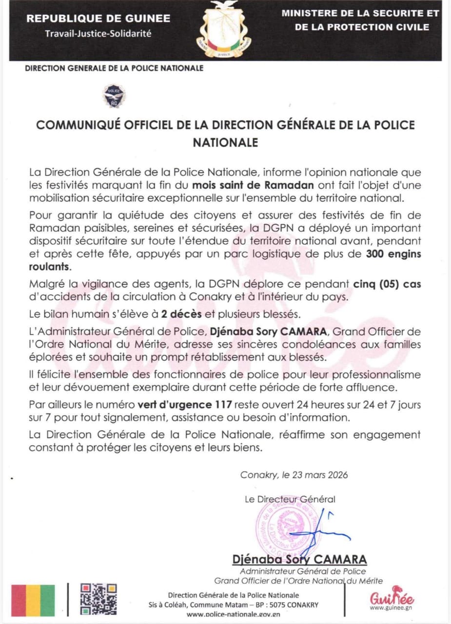 Dans un communiqué officiel, la Direction générale de la police nationale annonce avoir déployé un important dispositif sécuritaire sur toute l’étendue du territoire à l’occasion de la fin du mois de Ramadan. Si les festivités se sont globalement déroulées dans le calme, cinq accidents de la circulation ont été enregistrés à Conakry et à l’intérieur du pays, faisant deux morts et plusieurs blessés.