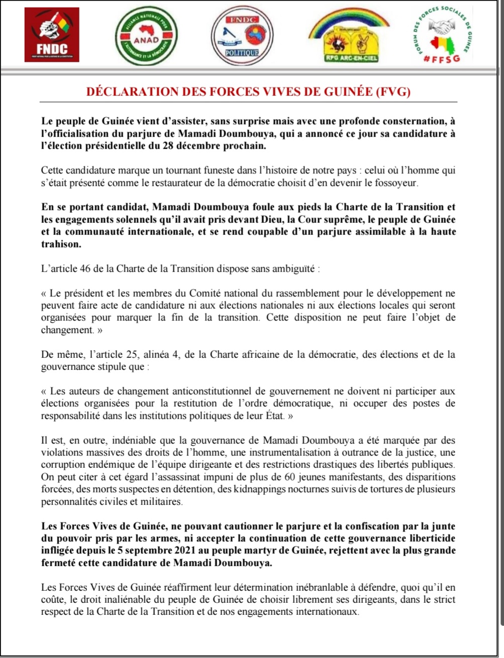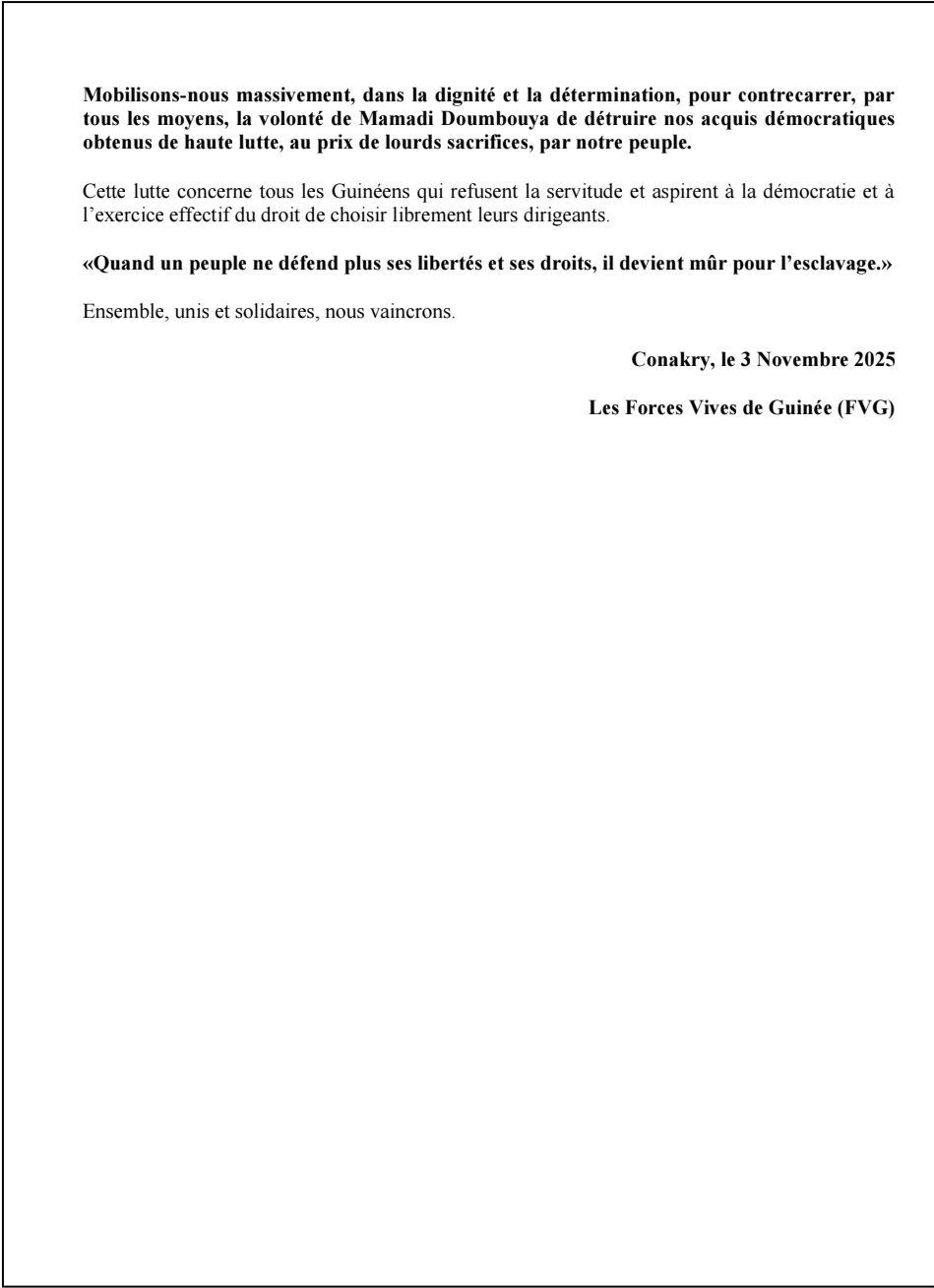 Dans une déclaration publiée ce 3 novembre 2025, les Forces Vives de Guinée dénoncent le parjure du chef de la junte, Mamadi Doumbouya, qui a annoncé sa candidature à la présidentielle du 28 décembre. Elles mettent en avant les violations des droits humains, la corruption et la restriction des libertés publiques, et appellent le peuple guinéen à se mobiliser pour défendre la démocratie et le droit de choisir librement ses dirigeants.