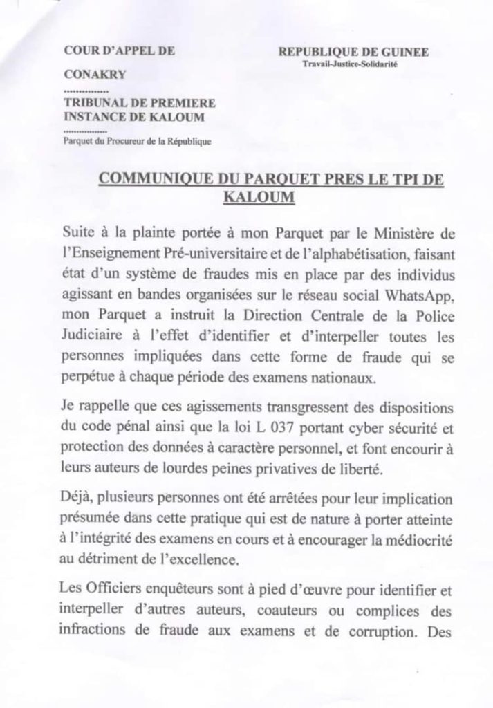 Suite à la plainte portée au Parquet par le Ministère de l’Enseignement Pré-universitaire et de l’alphabétisation, faisant état d’un système de fraudes mis en place par des individus agissant en bandes organisées sur le réseau social WhatsApp, le Parquet a instruit la Direction Centrale de la Police Judiciaire à l’effet d’identifier et d’interpeller toutes les personnes impliquées dans cette forme de fraude qui se perpétue à chaque période des examens nationaux.