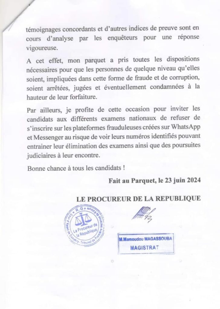 Les Officiers enquêteurs sont à pied d’œuvre pour identifier et interpeller d’autres auteurs, coauteurs ou complices des infractions de fraude aux examens et de corruption. Ci-dessous l’intégralité du communiqué du procureur général