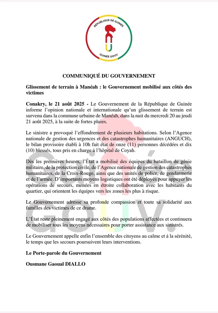 À la suite du glissement de terrain survenu dans la nuit du 20 au 21 août 2025 à Manéah, ayant fait 11 morts et 10 blessés, le Gouvernement guinéen annonce la mobilisation de moyens humains et logistiques pour porter assistance aux victimes et exprime sa compassion aux familles endeuillées.