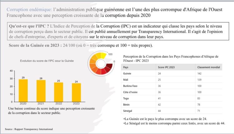 Selon l’Indice de Perception de la Corruption (IPC) de Transparency International, la Guinée est l’un des pays les plus corrompus d’Afrique de l’Ouest francophone, avec un score de seulement 24/100 en 2023. Ce score place la Guinée au 142e rang mondial sur 180 pays. Depuis 2020, la perception de la corruption ne cesse de s’aggraver, passant d’un score de 29 à 24.