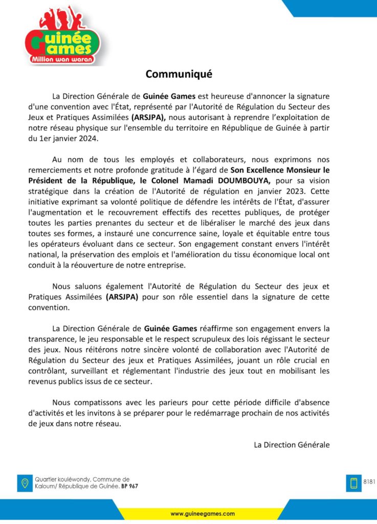 La direction générale de Guinée Games est heureuse d’annoncer la signature d’une convention avec l’État, représenté par l’autorité de régulation du secteur des jeux et pratiques assimilées (ARSJPA). Cette convention permet à l’entreprise de reprendre l’exploitation de son réseau physique sur l’ensemble du territoire en République de Guinée à partir du 1er janvier 2024.