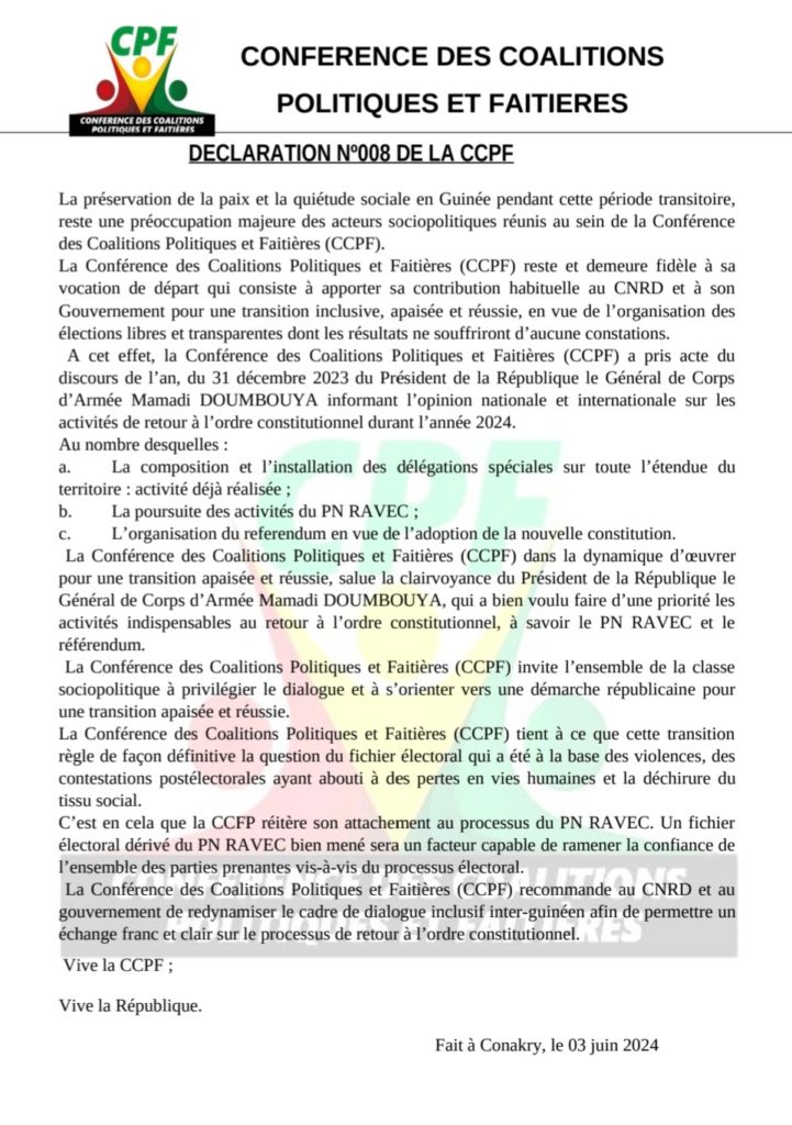 Dans une déclaration officielle, la Conférence des Coalitions Politiques et Faitières (CCPF) réaffirme son engagement en faveur d’une transition pacifique et réussie en Guinée.