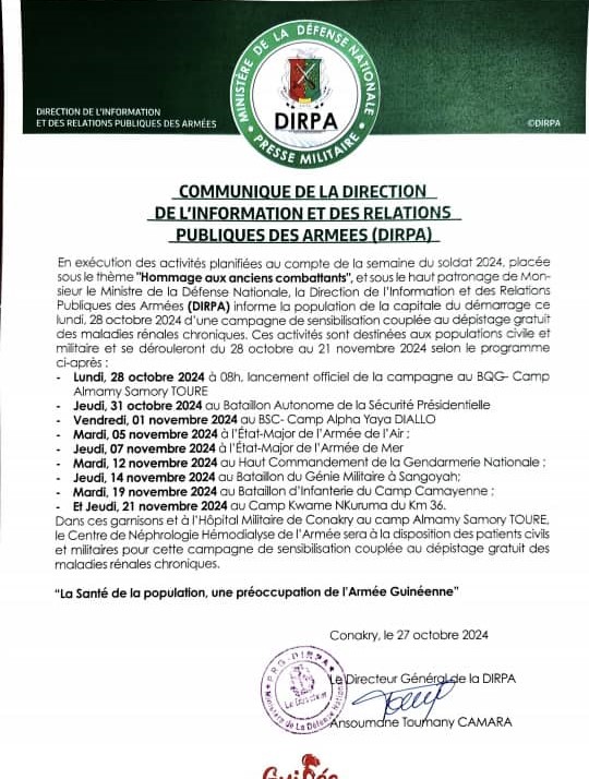 Après une journée d’assainissement organisée ce dimanche à Conakry, la Direction de l’information et des relations publiques des armées (DIRPA), annonce le démarrage, ce lundi 28 octobre 2024, d’une série d’activités dans le cadre de la semaine du Soldat 2024.