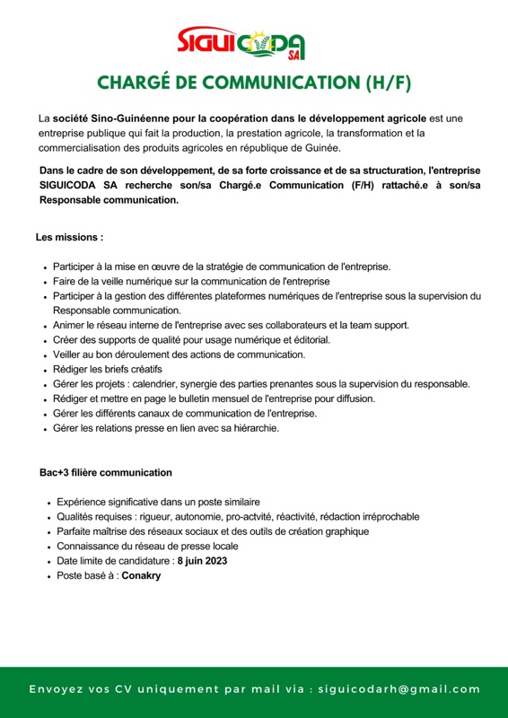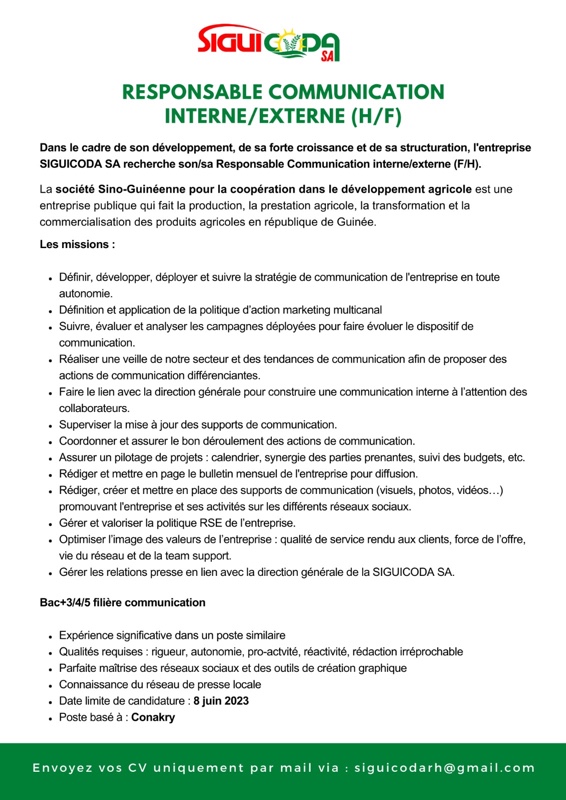 Guinée : la SIGUICODA recherche un responsable communication interne-externe (communiqué)