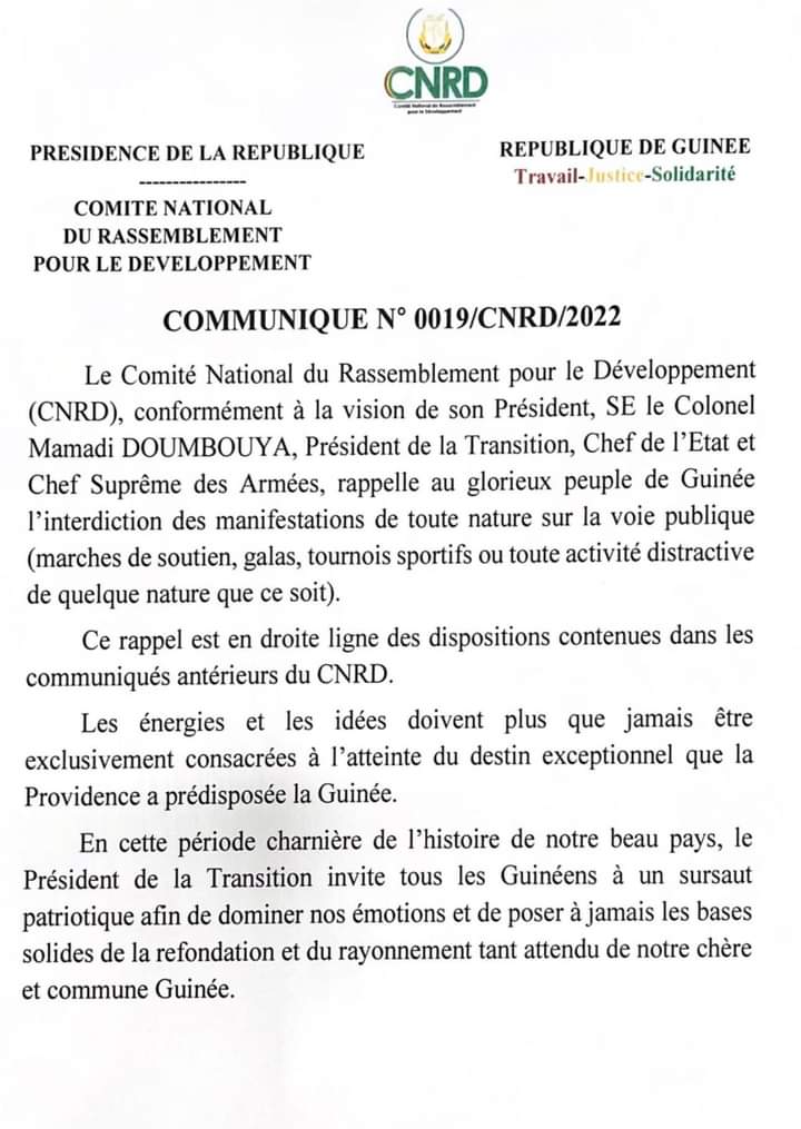 Dans un communiqué publié samedi soir, le comité national du rassemblement pour le développement a rappelé au peuple de Guinée l’interdiction des manifestations de toute nature sur la voie publique.