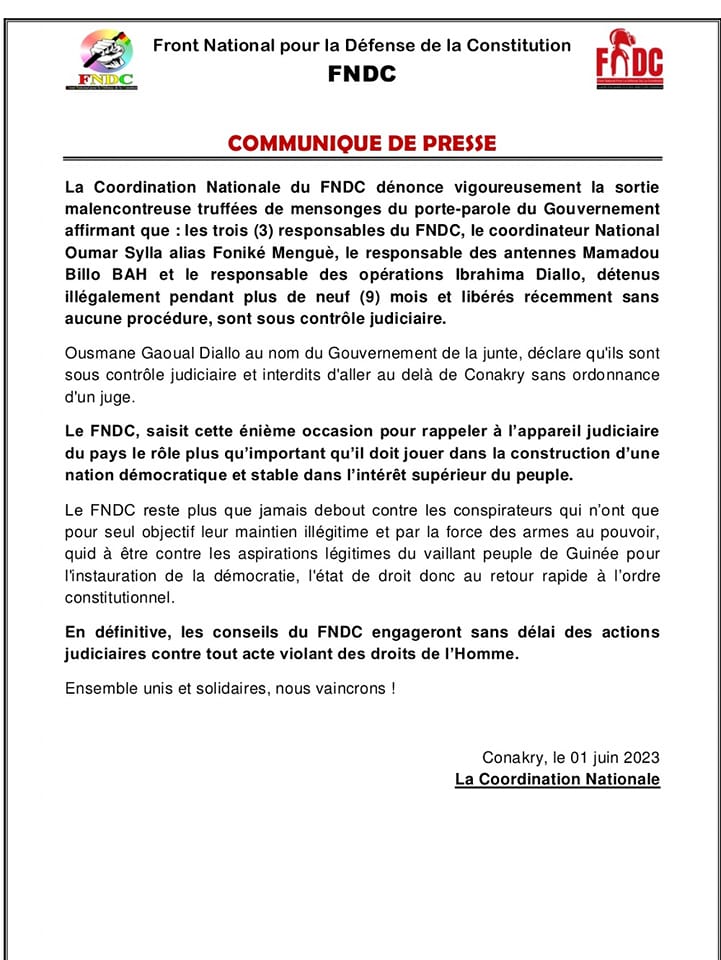 Le Front National pour la Défense de la Constitution (FNDC) répond à Ousmane Gaoual Diallo sur le cas Ibrahima Diallo qui avait été empêché de voyager sur le Niger pour prendre part au forum international sur l’espace civique.