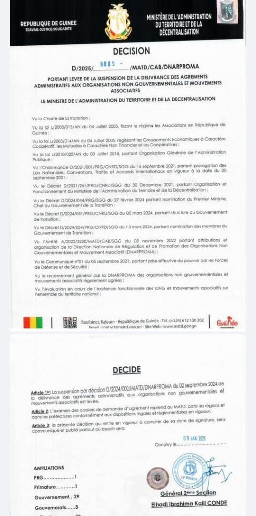 Guinée : Le MATD lève la suspension des agréments pour les ONG et mouvements associatifs