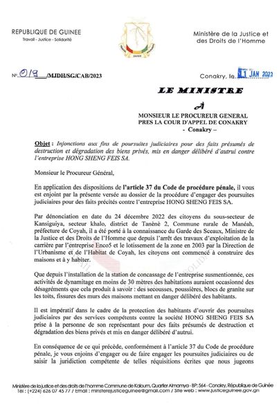 Guinée : le ministre de la justice instruit d’engager des poursuites contre l’entreprise HONG SHENG FEIS S.A !