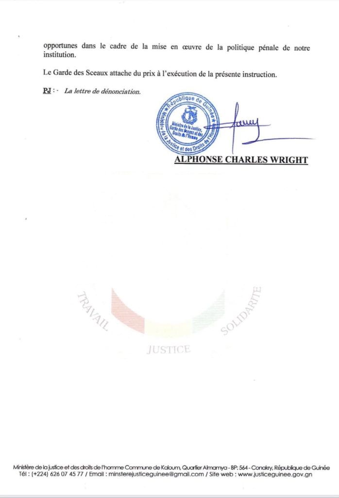 Alphonse Charles Wright a instruit au procureur général près la cour d’appel de Conakry d’engager des poursuites judiciaires contre l’entreprise HONG SHENG FEIS S.A pour des faits présumés de destruction et dégradation des biens privés, mis en danger délibéré d’autrui.