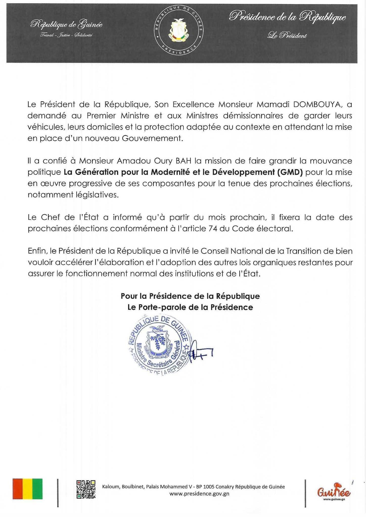 Dans un communiqué de la Présidence, le Président de la République a entériné la démission du Premier ministre et de son équipe, annoncé des mesures transitoires et fixé les grandes orientations vers la mise en place d’un nouveau Gouvernement.