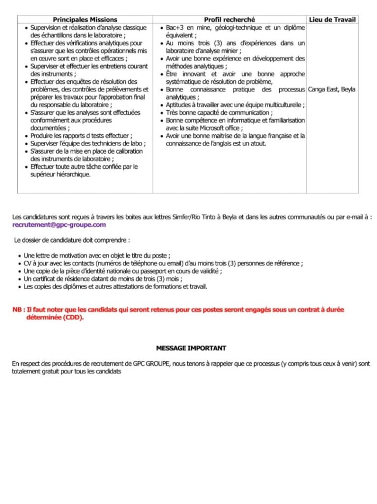 Dans le cadre de l’exécution d’un projet de construction pour le compte du projet Rio Tinto/SimFer (Simandou Sud), GPC recrute un superviseur laboratoire !