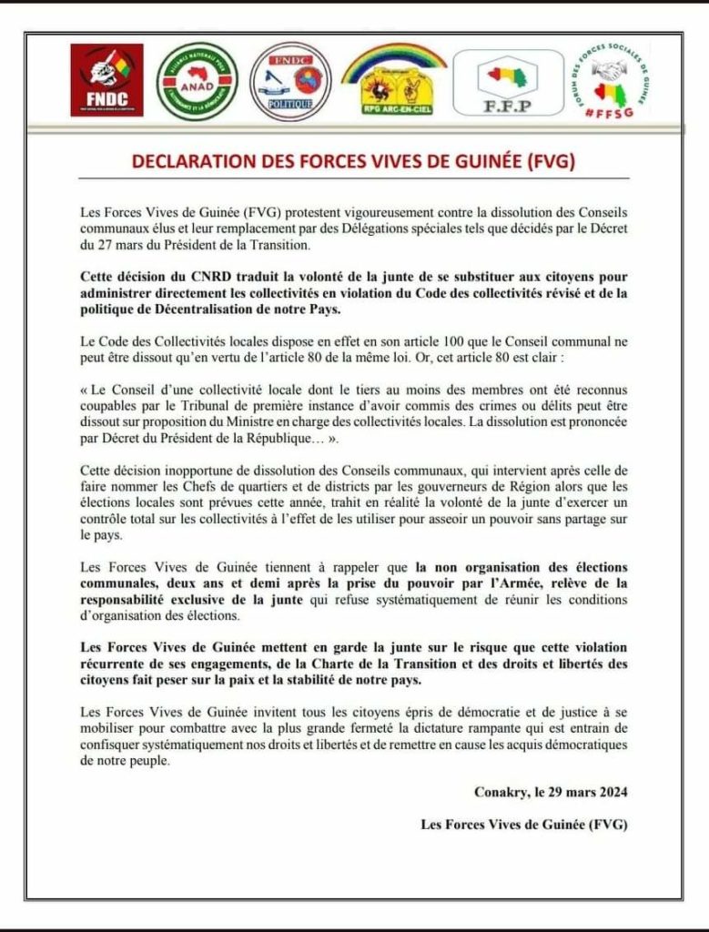 Dans une déclaration publiée ce vendredi 29 mars 2024, les forces vives de Guinée protestent contre la dissolution des Conseils Communaux.