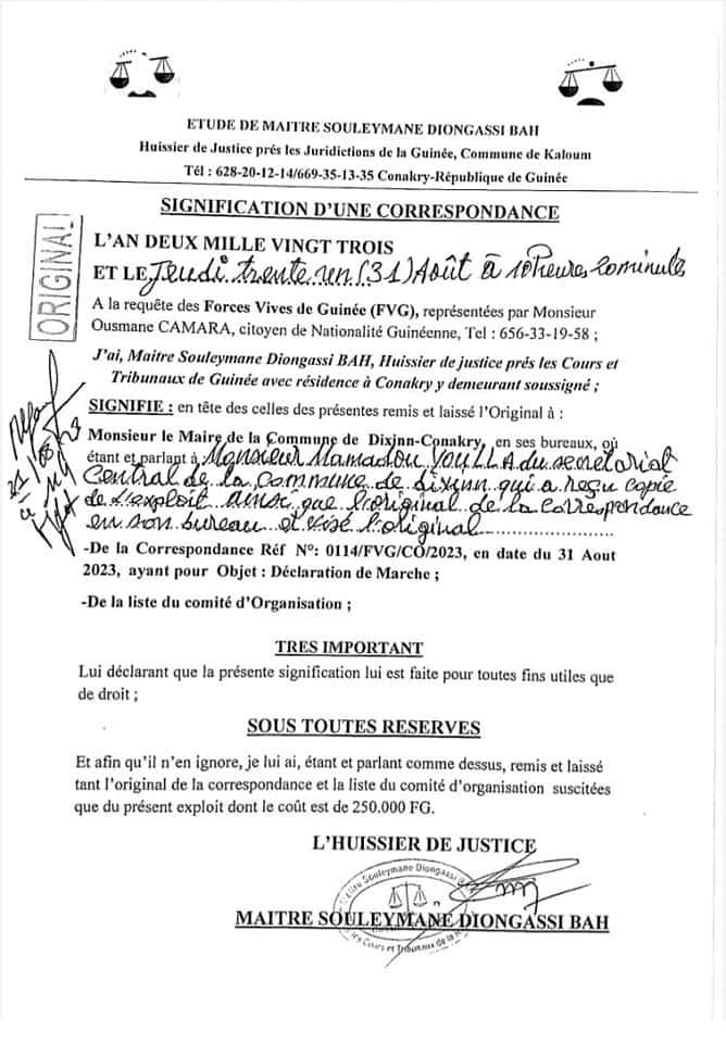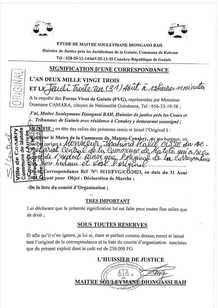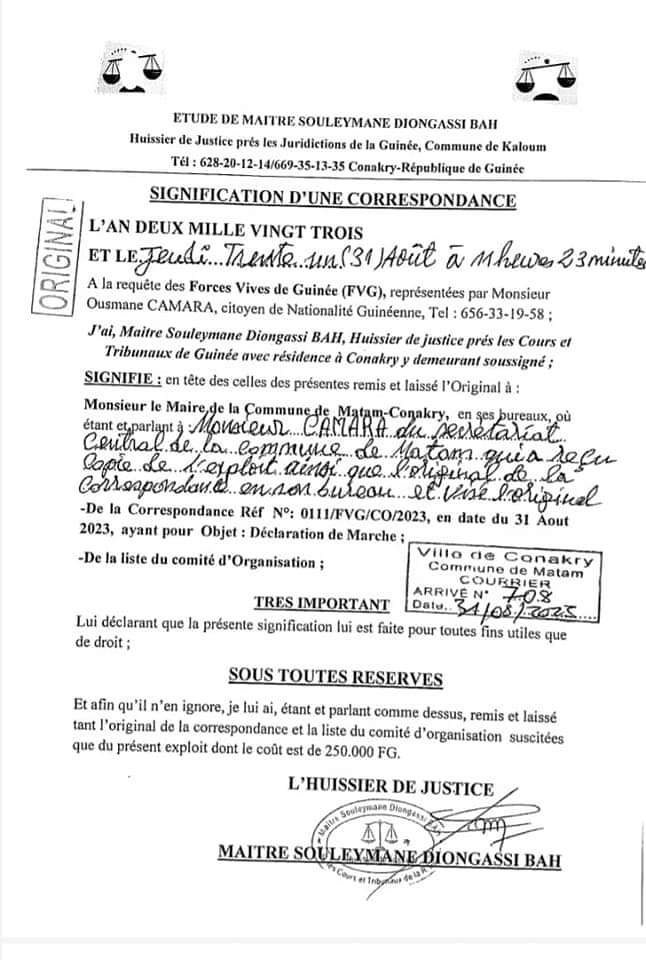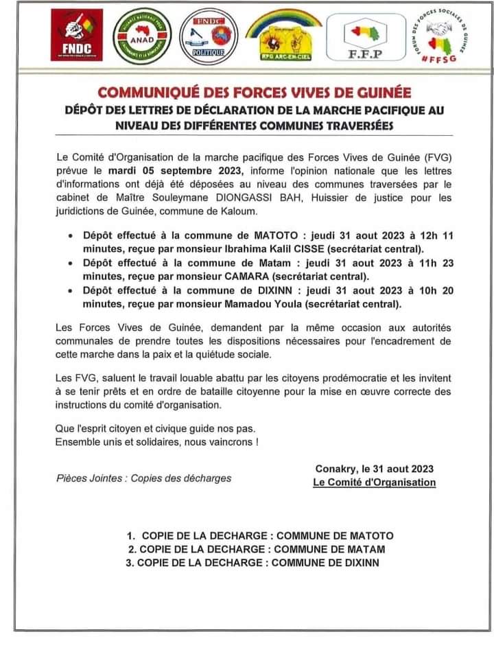 Les forces vives de Guinée comptent aller jusqu’au bout quant à la manifestation projetée le 5 septembre prochain. Pour mettre en application cette menace, les FVG annoncent avoir déposé ce jeudi 31 août 2023 les lettres de déclaration de la marche pacifique au niveau des différentes communes traversées.