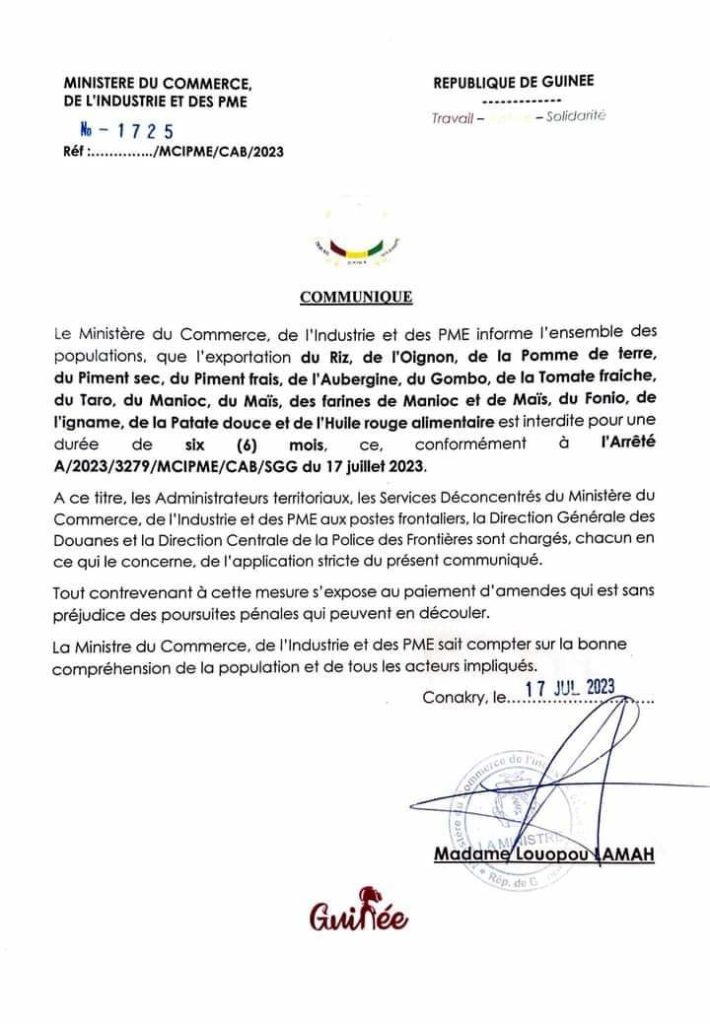 Dans un communiqué dont copie est parvenue à notre rédaction, le ministère du commerce, de l’industrie et des PME informé l’ensemble des populations que l’exportation de plusieurs denrées alimentaires est désormais interdite.