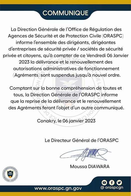 Dans un communiqué publié ce vendredi soir, l’office de régulation des agences de sécurité et de protection civile annonce la suspension temporaire de la délivrance et le renouvellement des agréments.