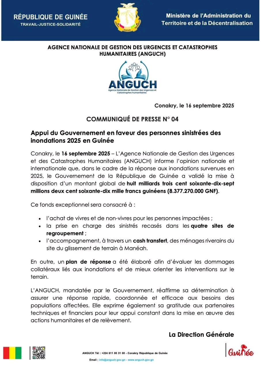 L’Agence Nationale de Gestion des Urgences et Catastrophes Humanitaires (ANGUCH) annonce la mise à disposition par le Gouvernement guinéen d’un fonds exceptionnel de 8,3 milliards GNF. Cette enveloppe servira à l’assistance alimentaire et non-alimentaire, à la prise en charge des sinistrés recasés et au soutien des ménages touchés par le glissement de terrain à Manéah.