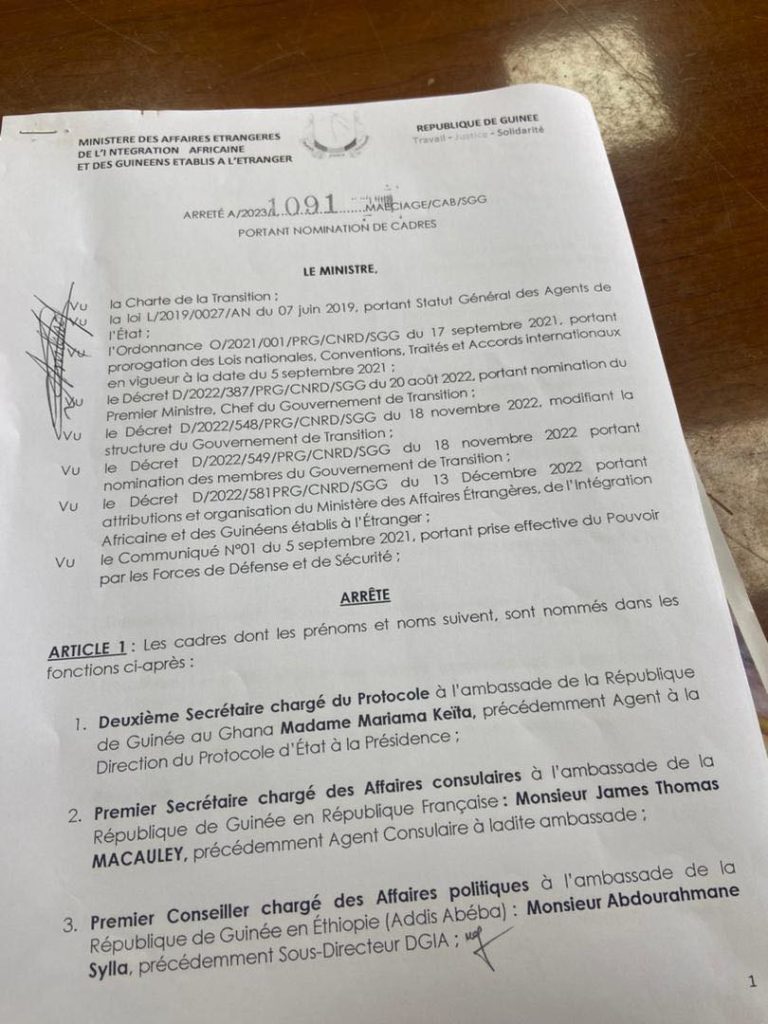 Plusieurs cadres ont été nommés dans les ambassades de Guinée à l’étranger au niveau du ministère des affaires étrangères, de l’intégration africaine et des Guinéens établis à l’étranger.