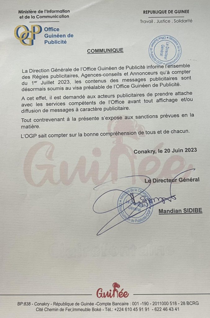 L’office Guinéen de Publicité informe l’ensemble des régies publicitaires, agences-conseils et annonceurs qu’à compter du 1er juillet 2023, les contenus des messages publicitaires sont désormais soumis au visa préalable de l’OGP.