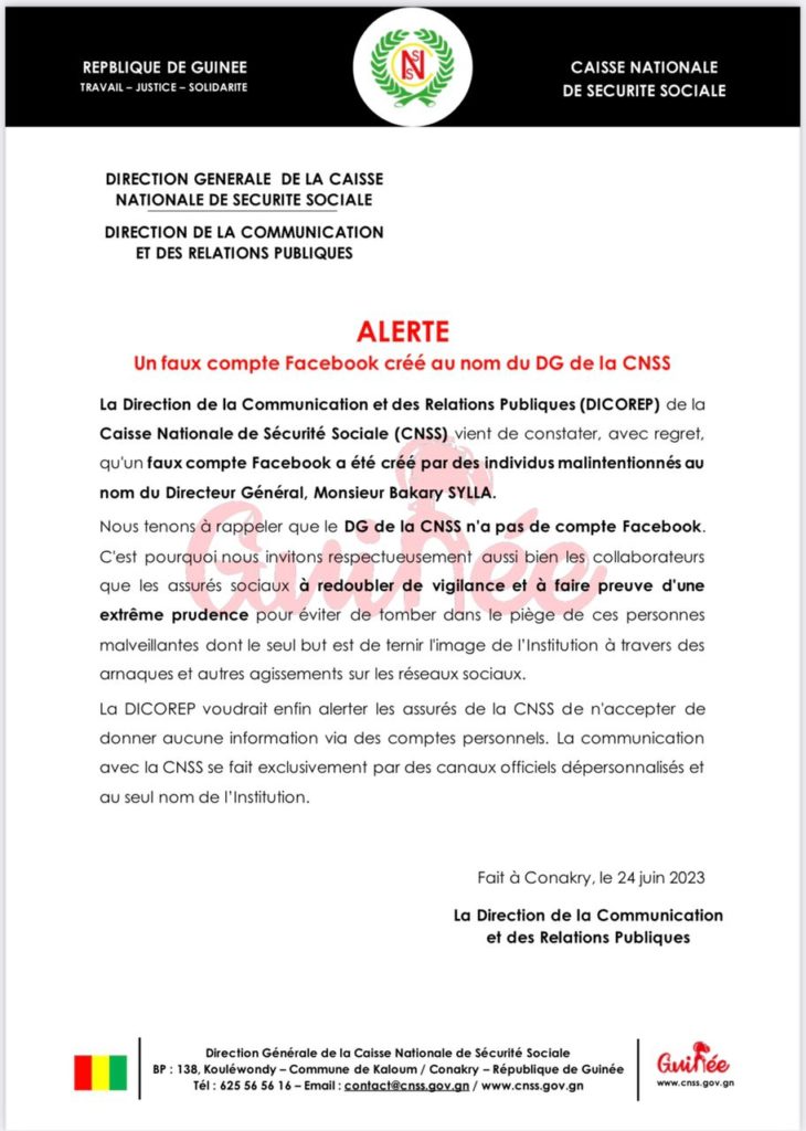 La direction de la communication et des relations publiques ( DICOREP) de la caisse nationale de sécurité sociale ( CNSS) constate avec regret, qu’un faux compte Facebook a été créé par des individus malintentionnés au nom du directeur général, Bakary Sylla.