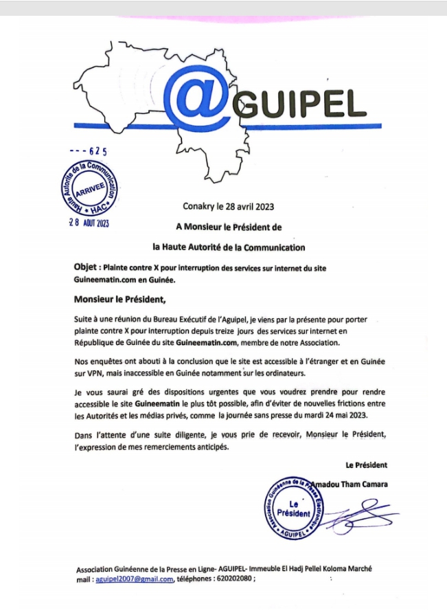 Le bureau exécutif de l’association guinéenne de la presse en ligne (AGUIPEL) réuni ce lundi 28 août 2023, a pris la courageuse décision de porter contre X pour l’interruption depuis 13 jours des services sur internet en République de Guinée du site Guineematin.com, membre de ladite association.