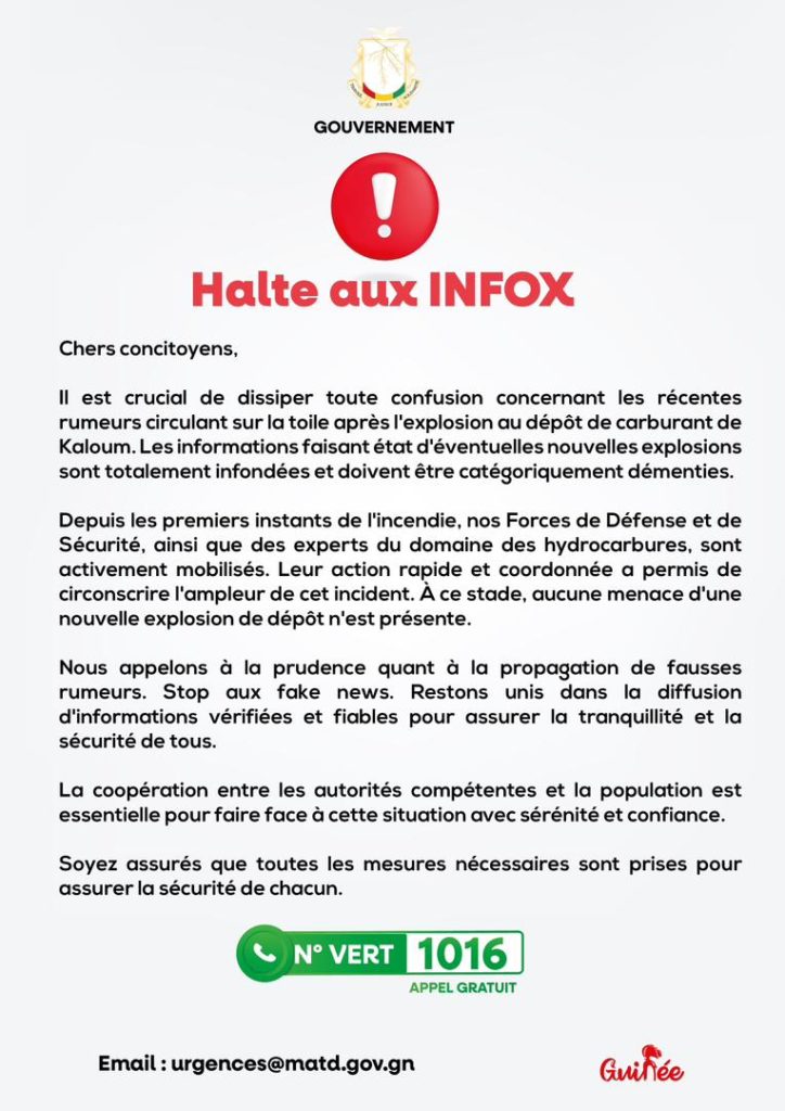 Dans son communiqué, le gouvernement guinéen indique que « les informations faisant état d’éventuelles nouvelles explosions sont totalement infondées et doivent être catégoriquement démenties ».