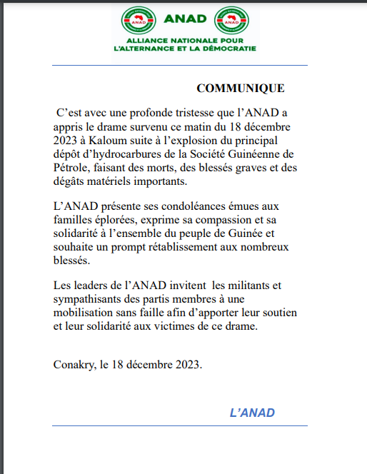 L’ANAD présente ses condoléances émues aux familles éplorées, exprime sa compassion et sa solidarité à l’ensemble du peuple de Guinée et souhaite un prompt rétablissement aux nombreux blessés. Les leaders de l’ANAD invitent les militants et sympathisants des partis membres à une mobilisation sans faille afin d’apporter leur soutien et leur solidarité aux victimes de ce drame.