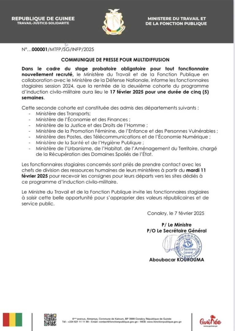 Le Ministère du Travail et de la Fonction Publique, en partenariat avec le Ministère de la Défense Nationale, annonce le début du programme d’induction civilo-militaire pour la deuxième cohorte des fonctionnaires stagiaires session 2024. Les concernés, issus de plusieurs départements ministériels, sont attendus dès le 17 février 2025 pour un stage de cinq semaines.