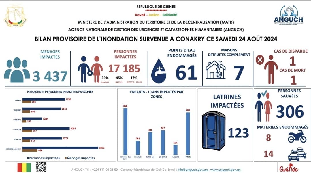 Suite aux inondations qui ont frappé Conakry ce samedi 24 août 2024, le Ministère de l’Administration du Territoire et de la Décentralisation (MATD), en collaboration avec l’Agence Nationale de Gestion des Urgences et Catastrophes Humanitaires (ANGUCH), a dressé un bilan provisoire des dégâts. Ce rapport initial met en lumière l’ampleur des destructions et l’urgence d’une réponse coordonnée face à cette catastrophe naturelle.