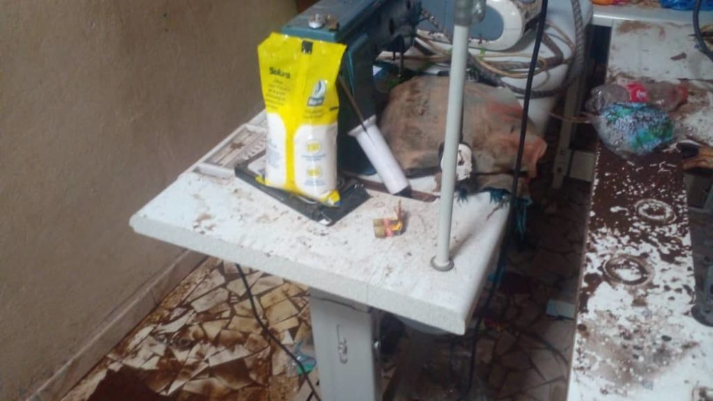 « Ce n’est que ce matin que mon apprenti m’a informé que des individus ont percé le toit de notre atelier pour s’introduire et dérober les habits cousus et non que nous avons dedans. Pour le moment c’est des simples estimations qu’on a pu faire puisque les objets volés sont de trop mais en attendant les vrais calculs on a perdu plus de 35 millions sans compter les machines qui ont été détruites. Celle que vous voyez là coûte plus de trois millions et elle n’est pas seule qui est détruite. Bon on a quand-même fait une déclaration à la police et un communiqué à la radio l’on se contente pour le moment de ça », a-t-elle fait savoir.