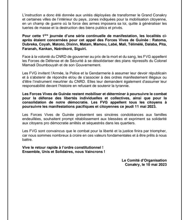 Ils invitent les citoyens à poursuivre la mobilisation demain jeudi 11 mai conformément à son premier calendrier publié il y a quelques jours.