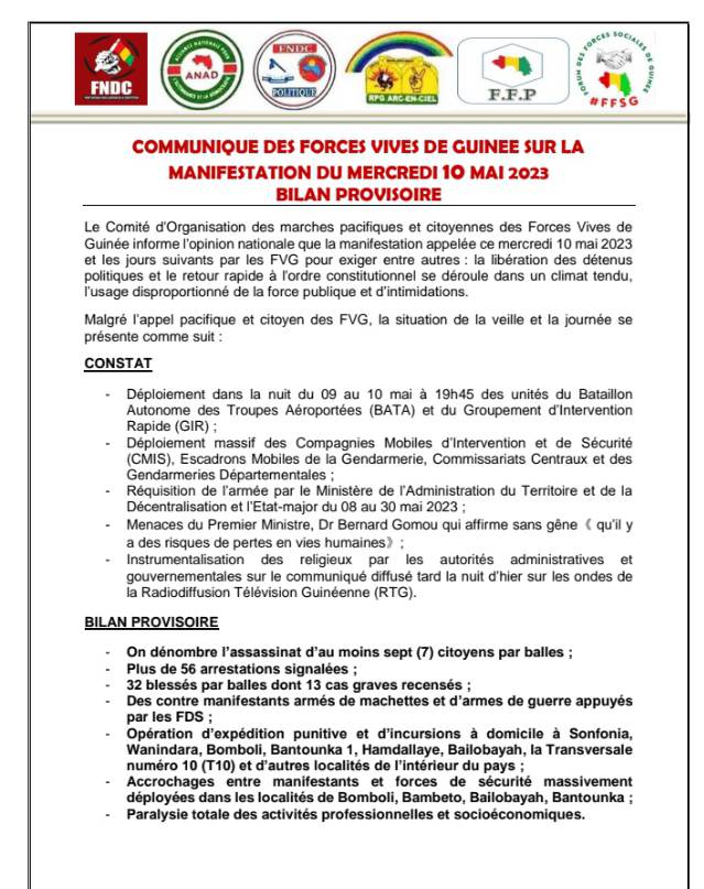 Dans leur bilan publié ce mercredi soir, les FVG déplorent le déploiement de l’armée sur le terrain par le Ministère de l’administration du territoire et les propos du Premier ministre Dr Bernard Goumou qui aurait proféré des menaces contre les manifestants.
