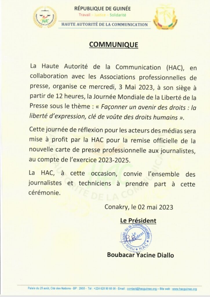 La haute autorité de la communication en prélude à la célébration de la journée mondiale de la liberté de la presse prévue le 03 mai 2023, annonce l’organisation une journée de réflexion pour les acteurs des médias en collaboration avec les associations de presse.